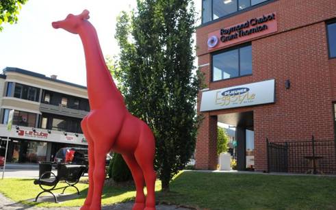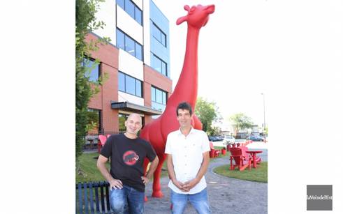 La girafe rouge qui veille depuis vendredi matin sur la place Johnson, c'est le duo d'artistes granbyens qui l'a confectionnée dans son atelier de la rue Cartier...